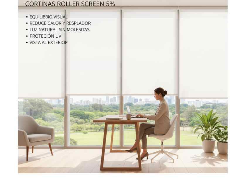 Se elige una Cortina Roller Screen 5% para un equilibrio entre luz natural, visibilidad hacia el exterior y privacidad diurna, ya que ofrece una buena protección UV y reduce el calor sin oscurecer completamente el espacio. Es ideal para oficinas y salas de estar, ya que evita el deslumbramiento en pantallas y protege los muebles del desgaste solar, manteniendo un ambiente confortable y moderno.